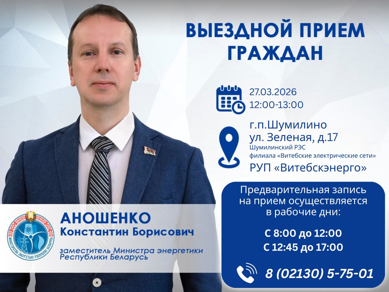 Прием пройдет в Шумилинском РЭС (филиал «Витебские электрические сети» РУП «Витебскэнерго») по адресу: г.п. Шумилино, ул.Зеленая, д.17