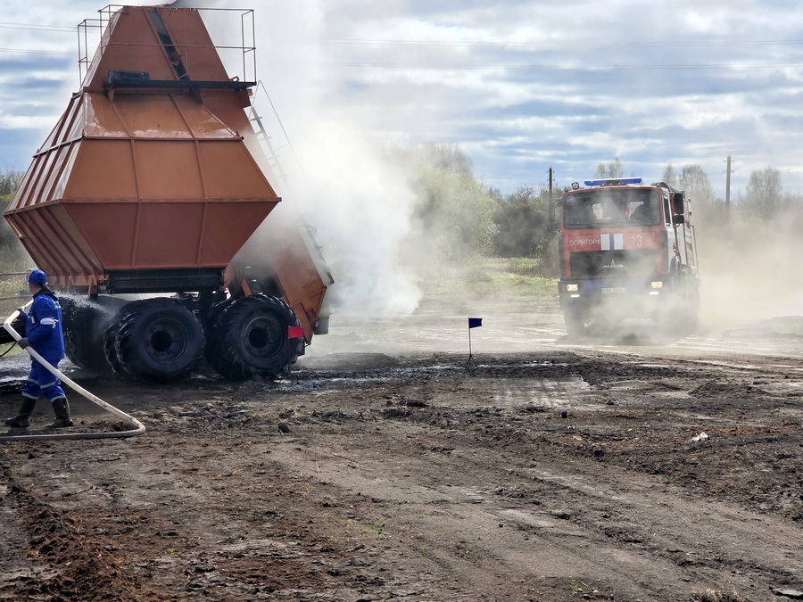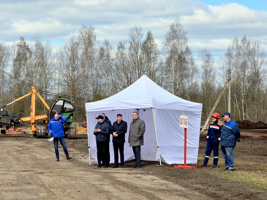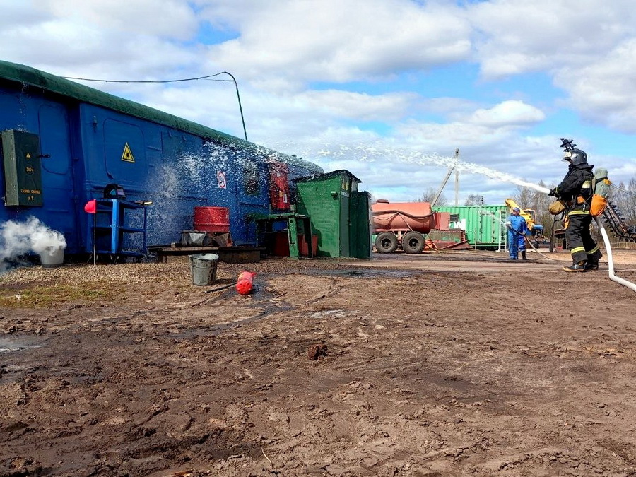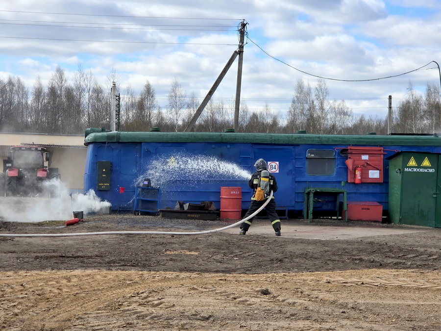 Согласно легенде учений, на территории полевой базы во время проведения ремонтных работ произошло короткое замыкание электрооборудования, что привело к возгоранию сварочного поста. При эвакуации техники огонь распространился на торфодобывающую машину, находившуюся вблизи воздушной линии электропередачи. В ходе ликвидации аварии один из работников получил ожоги рук.