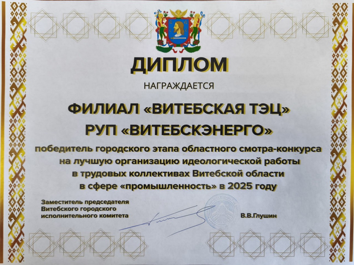 Витебский горисполком подвел результаты городского этапа. В сфере промышленности в число победителей вошел филиал «Витебская ТЭЦ», продемонстрировав высокий уровень организации идеологической работы в коллективе.